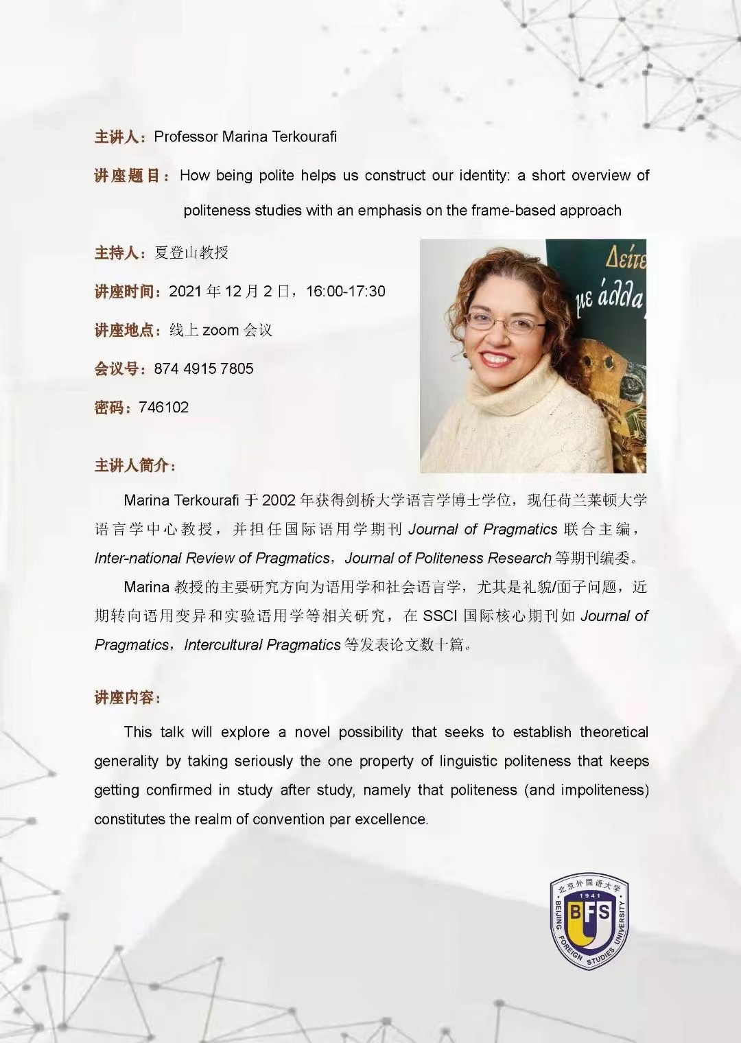 12月2日讲座:How being polite helps us construct our identity: a short overview of politeness studies with and emphasis on the frame-based approach
